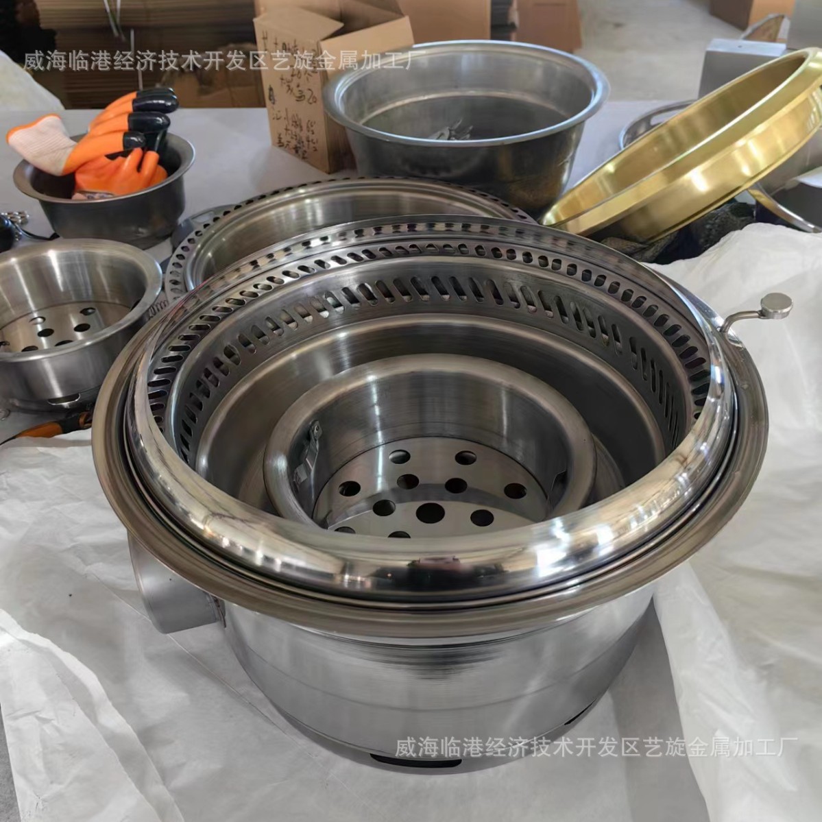 材质不锈钢钢,使用原料为木炭,由外筒、水盆、炭盆、隔热层、拢烟圈、盖子组成。室内使用需配下排烟管道,户外使用也可以不用排烟设备,适用于烧烤烤肉店和韩式料理店及日式烧肉店