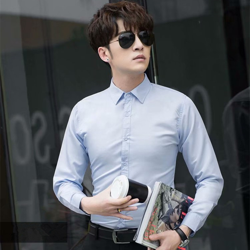 봄과 가을 새로운 흰색 셔츠 남자의 긴 소매 단색 비 다림질 셔츠 비즈니스 슬림 청소년 얇은 코트 머리카락의 세대스토어 가기