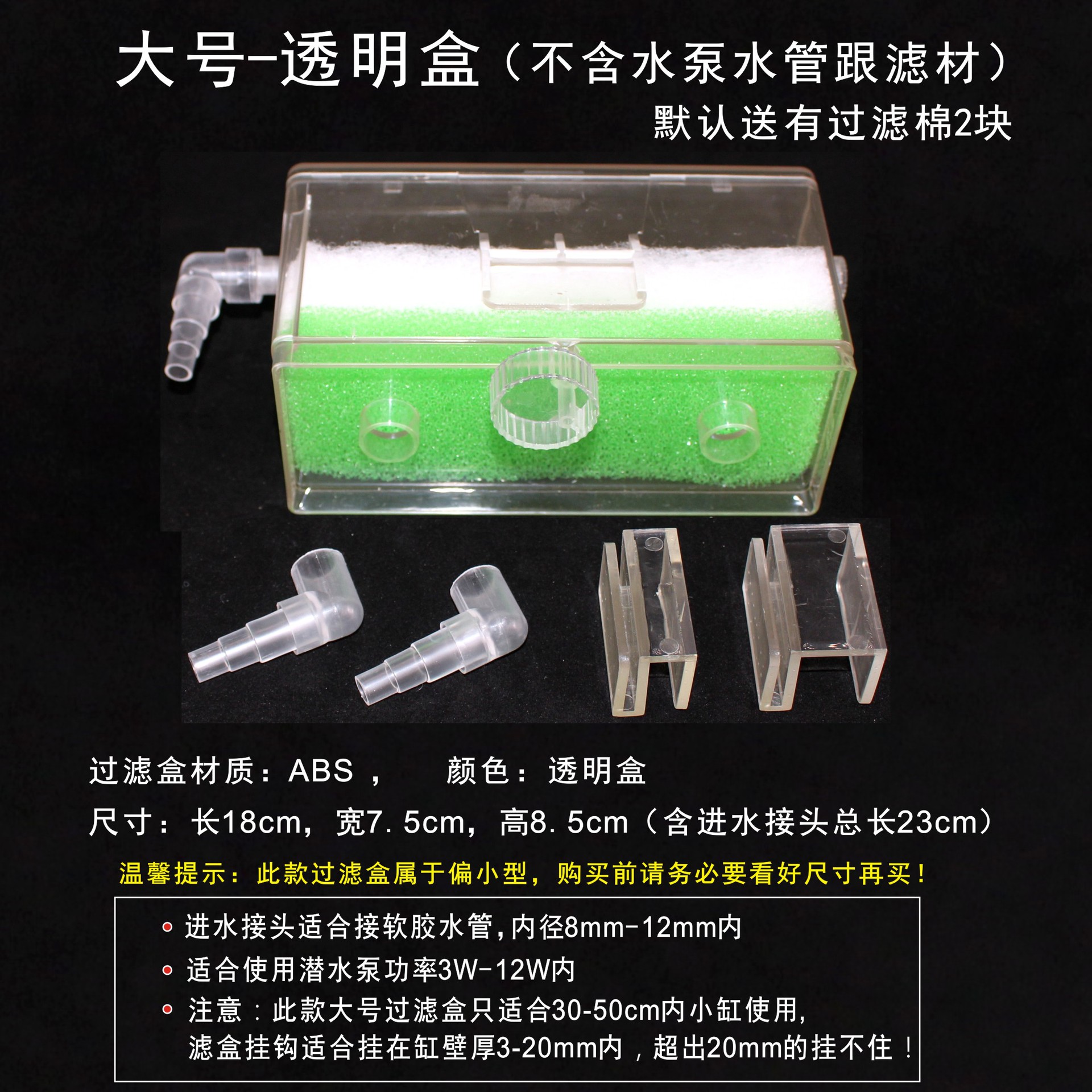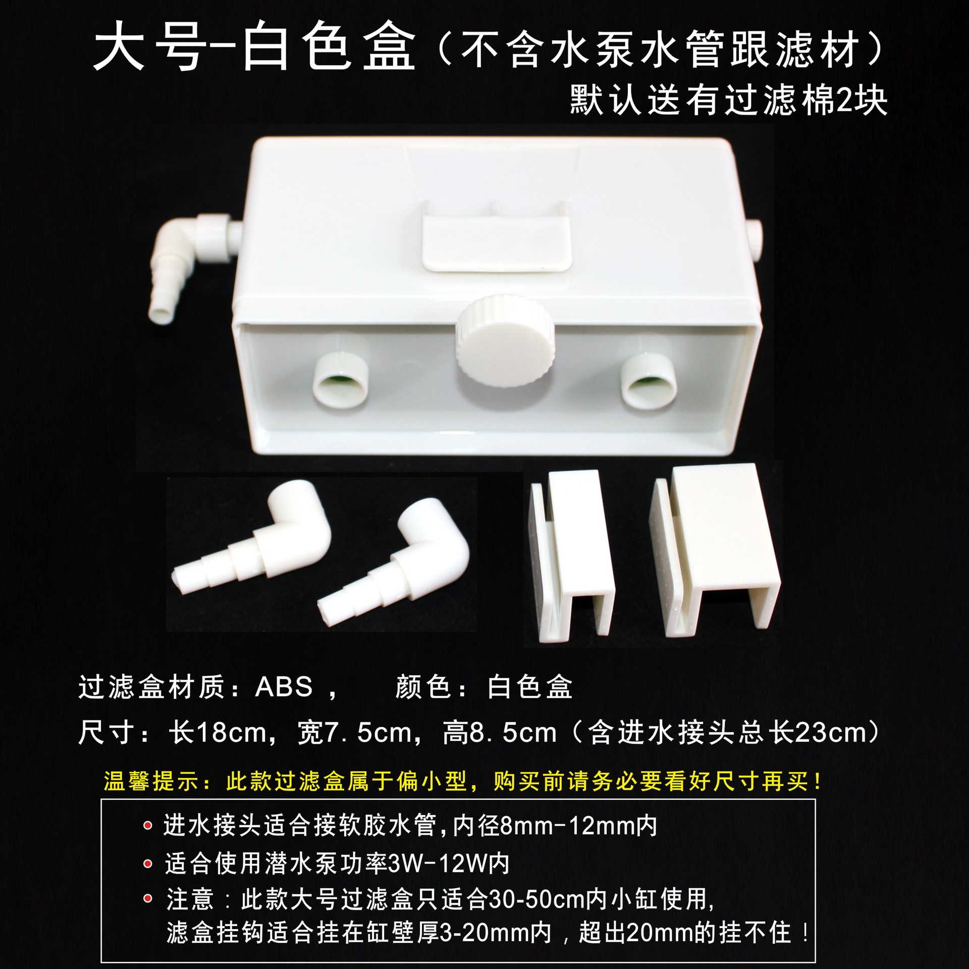 大号过滤盒尺寸:长18cm,   宽7.5cm,高8.5cm。适合挂在缸边壁厚3mm-20mm内