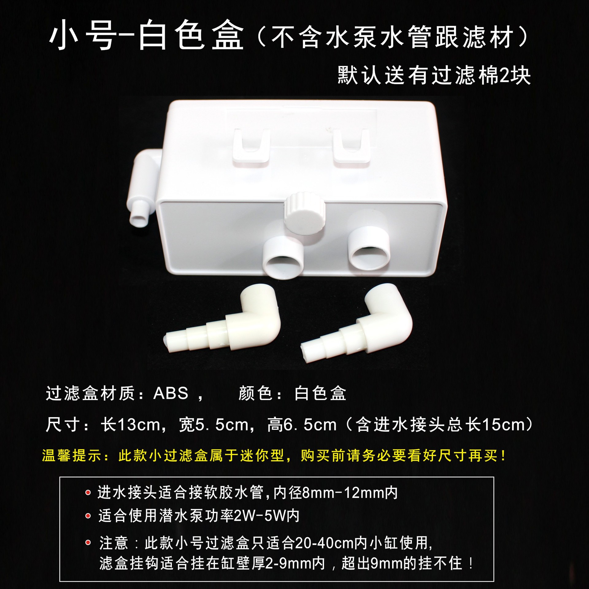小号过滤盒尺寸:长13.5cm,宽5.5cm,高6.5cm。适合挂在玻璃缸壁厚2mm-9mm内。