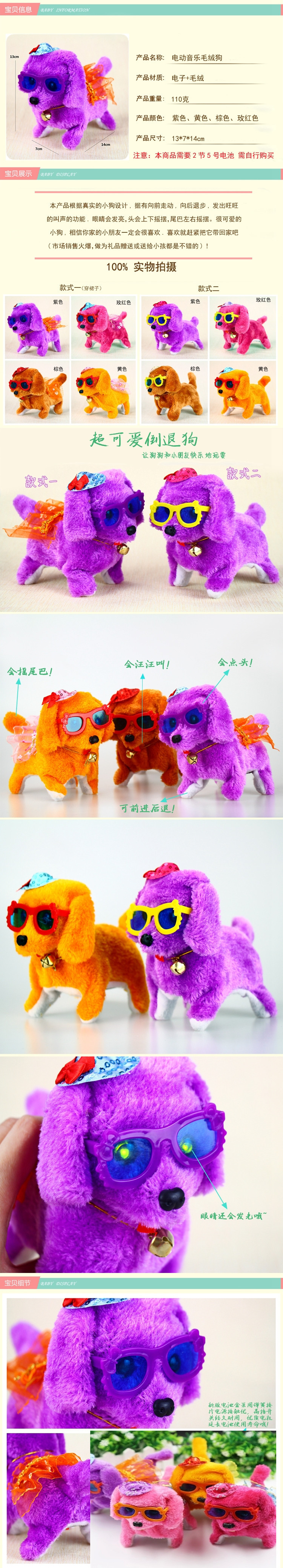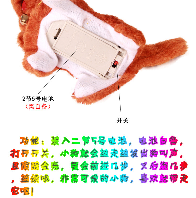 功能:装入二节5号电池,电池自备,打开开关,小狗就会边走边发出狗叫声,且眼睛会亮,更会前进几步,又后退几步,连续哦,非常可爱的小狗,喜欢就带走它吧!颜色混装.如果要特定颜色要联系客服  客服答应了才能按要求颜色发货  留言无效