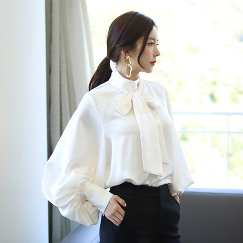 가을 새로운 패션 레이스 업 랜턴 슬리브 단색 쉬폰 셔츠 여성 긴 소매 느슨한 풀오버 셔츠스토어 가기