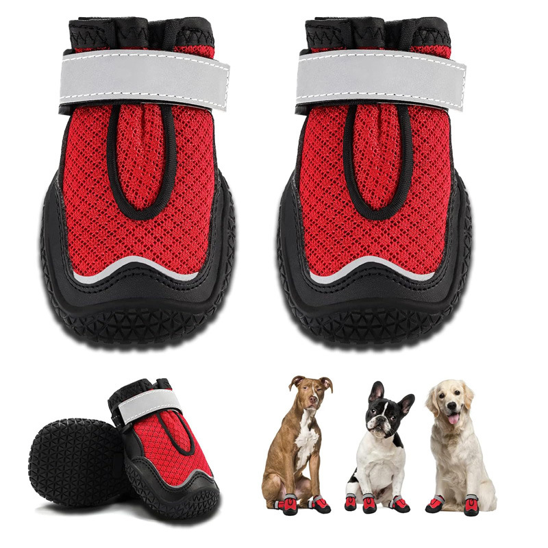【本品特点】:皮革位置是超纤,特制透气网布,橡胶菱形大底 防滑,耐磨,防撞有效保护狗狗脚掌。3M反光条,夜晚出行更安全。