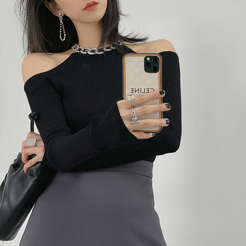 여성용 플래시 다이아몬드 쇄골 체인 오프 숄더 섹시 니트 스웨터, 가을 겨울 슬림핏 이너웨어 탑, 패셔너블하고 다용도스토어 가기