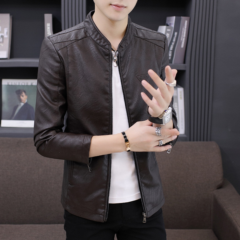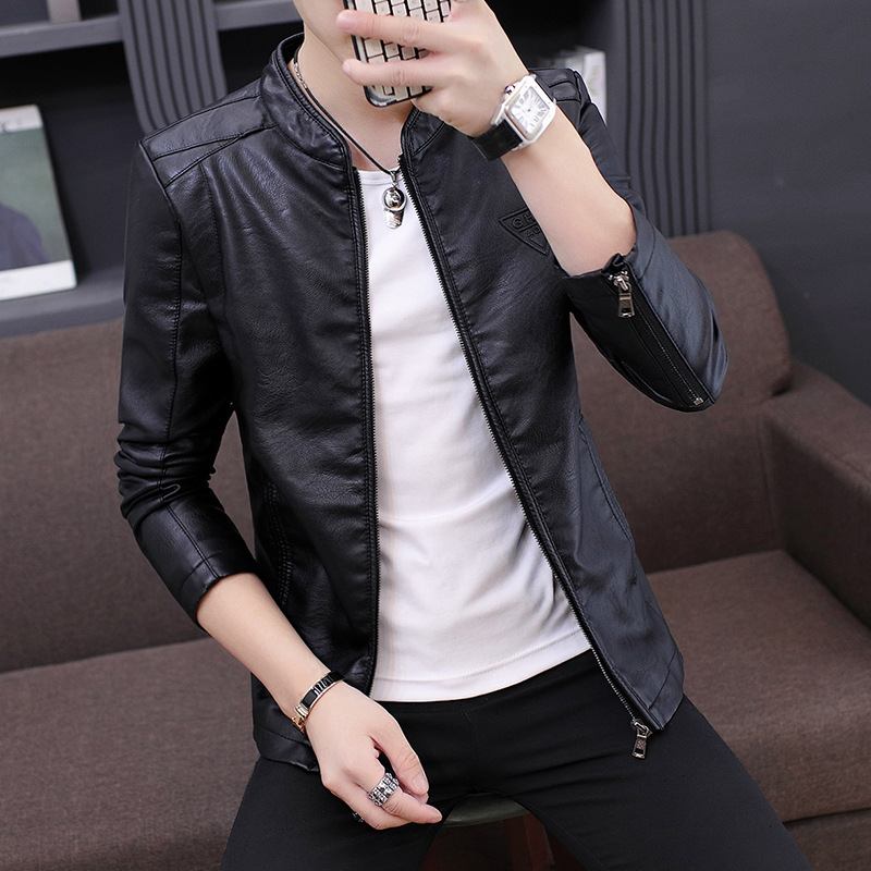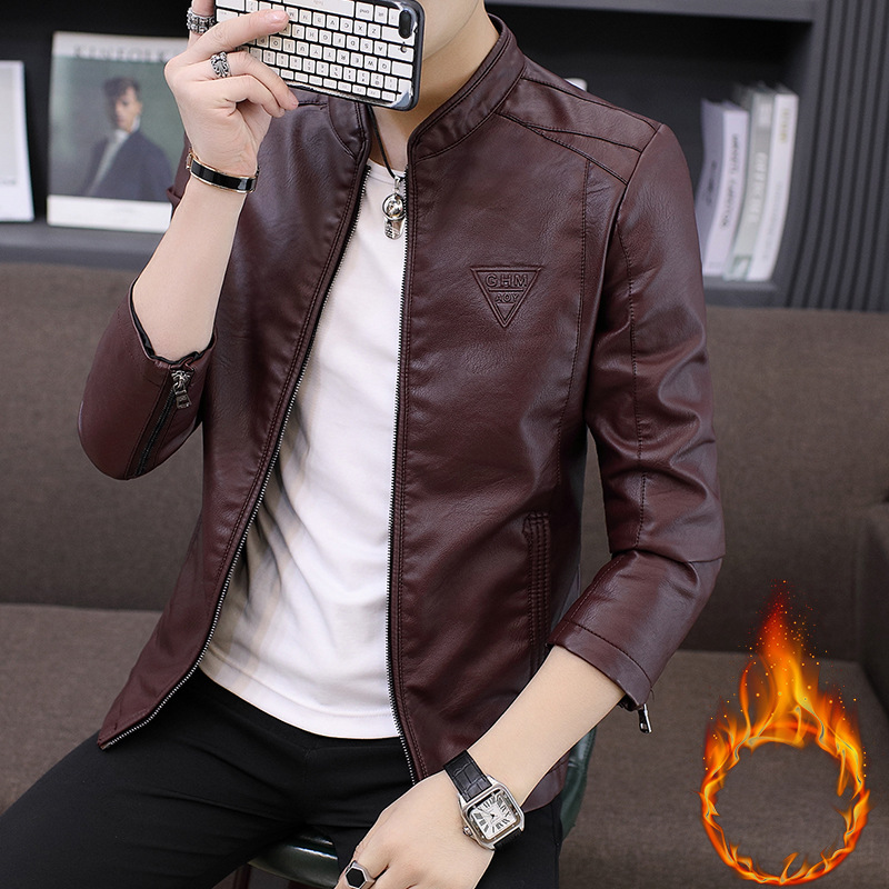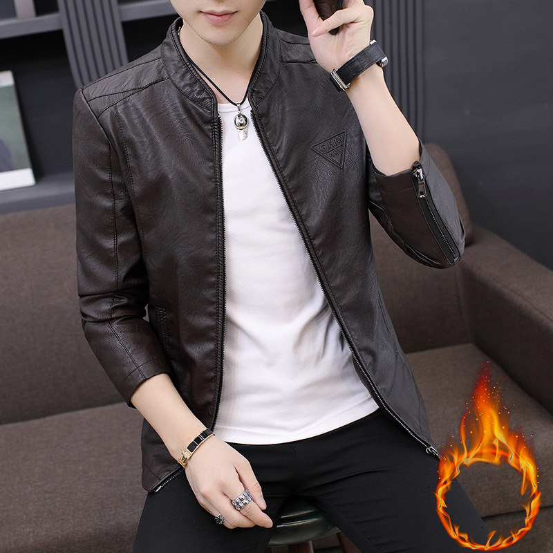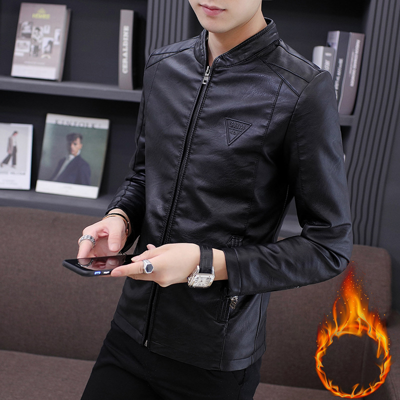 남성 가죽 자켓 겨울 한국 스타일 슬림핏 트렌디 캐주얼 다용도 젊은 남성용 멋진 PU 자켓 스탠드 칼라 플리스 안감 가죽 자켓스토어 가기