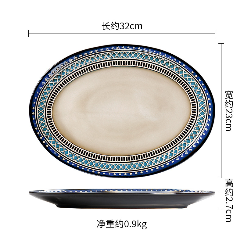 椭圆长盘:长:36.5cm、宽:19.3cm、高:2.6cm、净重:0.9kg 装箱数:15个/箱