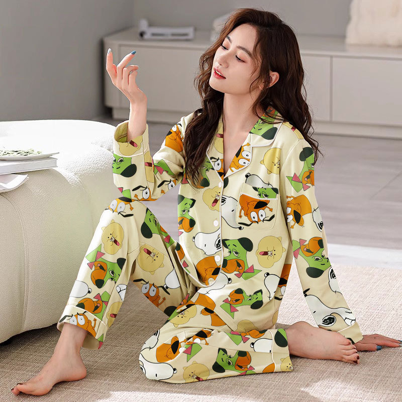 봄 가을 새 잠옷 여성용 카디건 긴팔 바지 한국 스타일 소녀 간단한 만화 홈 옷 세트 입을 수 있습니다
