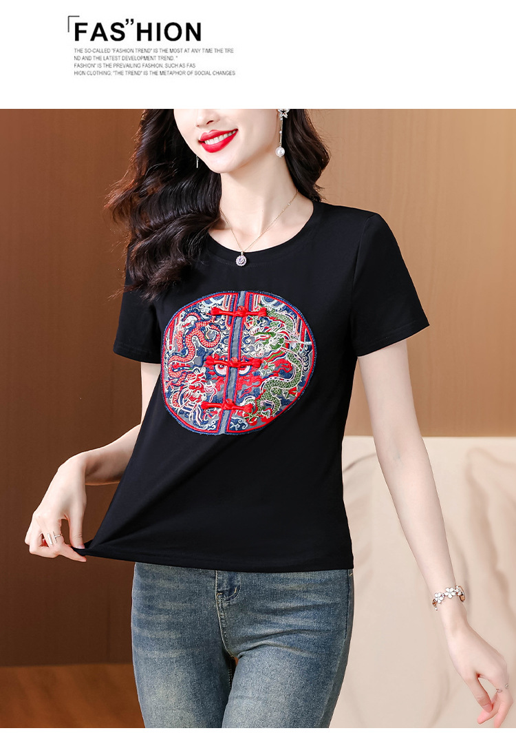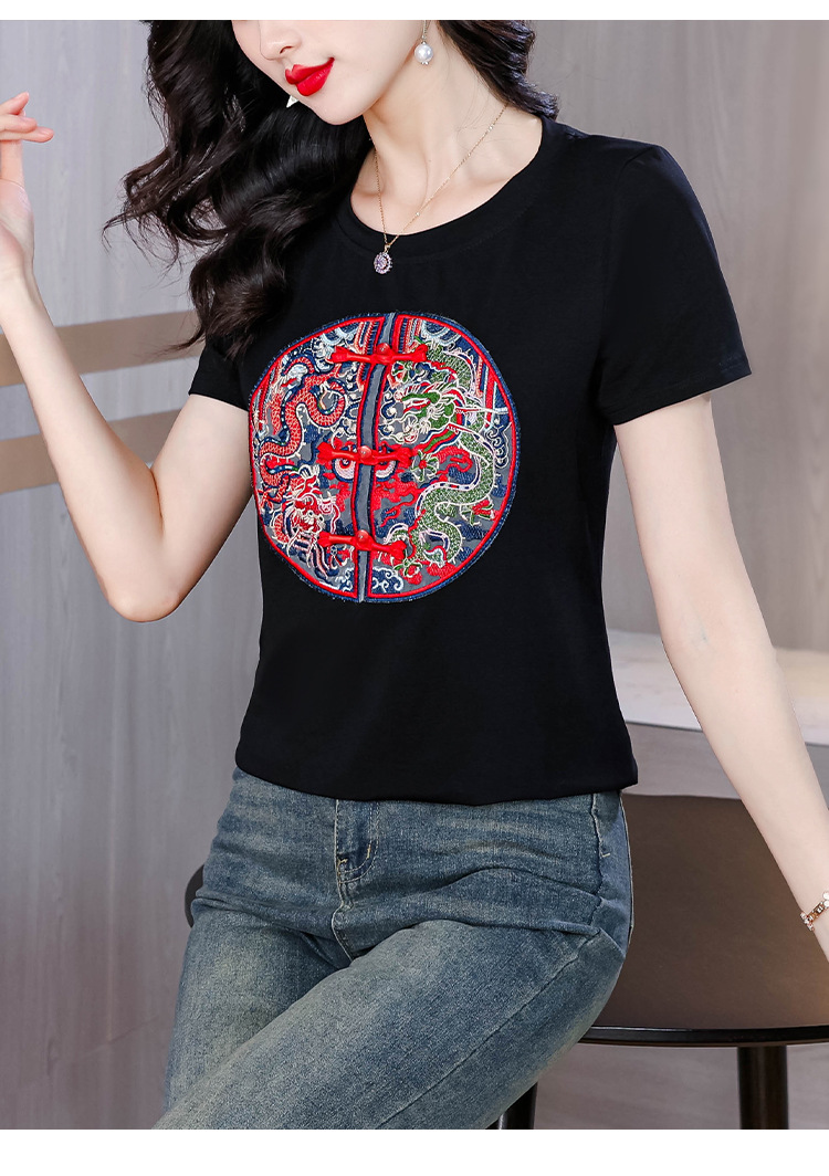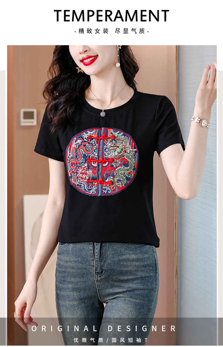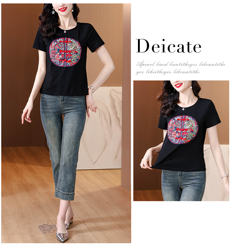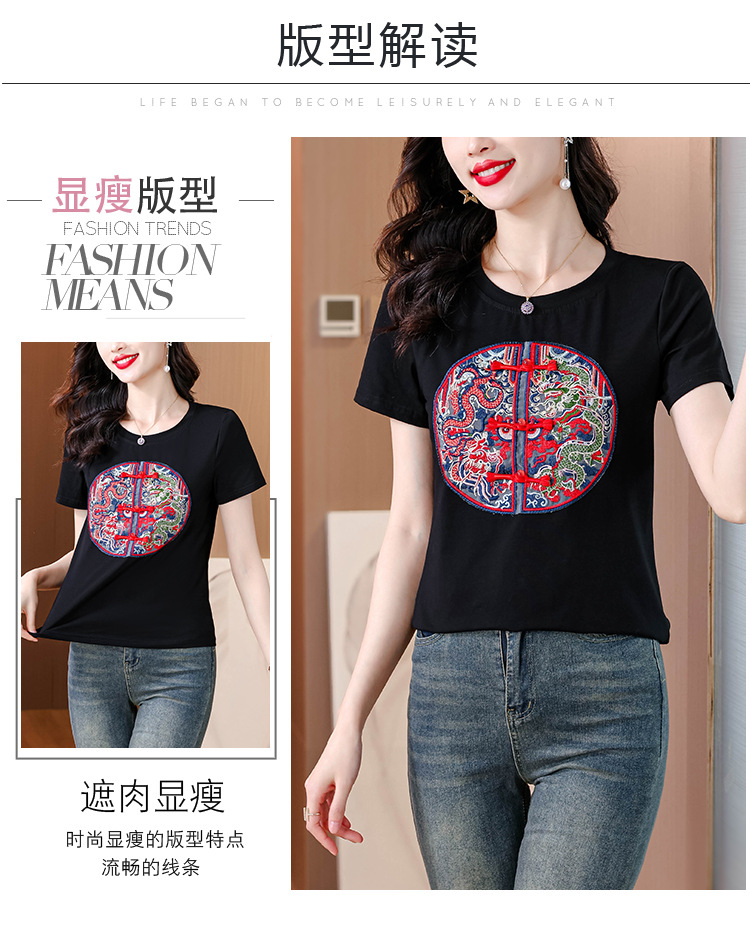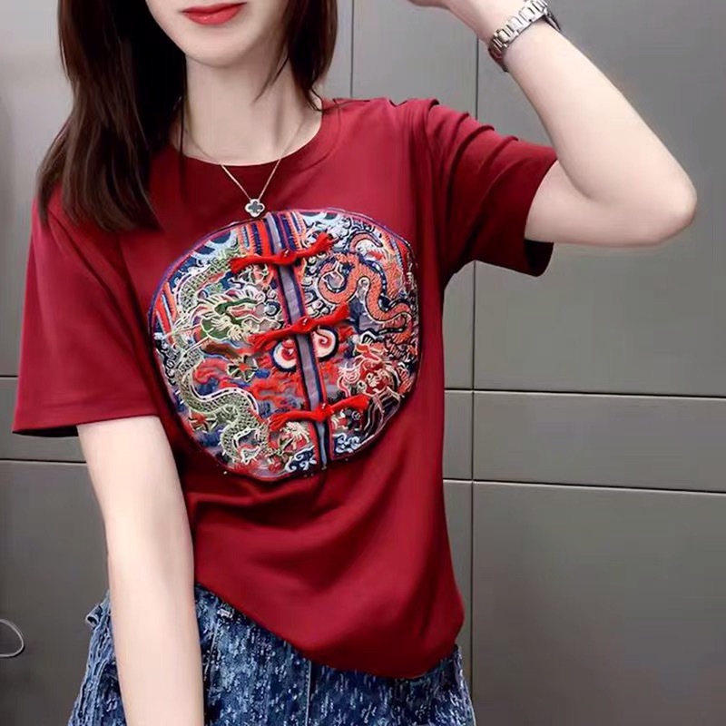 2026년 여름 신상 라운드넥 반팔 티셔츠 여성용 신중국풍 자수 다용도 정형 어깨탑스토어 가기