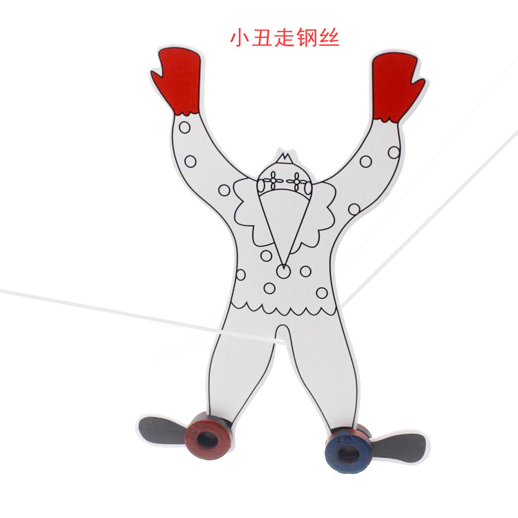 小丑走钢丝课件 实验重点:感知物体的重心与稳定的相互关系。 实验目的: 1.了解什么是重心。 2.了解重心与支点的变化。 实验认知:重心,是在重力场中,物体处于任何方位时所有 各组成质点的重力的合力都通过的那一点。规则而密度均匀 物体的重心就是它的几何中心。不规则物体的重心,可以用 悬挂法来确定。物体的重心,不一定在物体上。另外,重心 可以指事情的中心或主要部分。 支点:是支撑物体的那个点,本课中的塑料竖棍与物体接触 的点就称为支点。 实验步骤:1.认识实验器材:小丑模型、磁铁、棉线、吸盘。 2.有水彩笔的同学把小丑打扮一下,取一支铅笔或用一只手指 如何能让小丑模型在手指(铅笔)上保持平衡不掉?接下来用 四块磁铁分别吸在小丑模型的两只手掌对称的地方,再用手指 (铅笔)抵在小丑的嘴部作支点,看看会有什么结果和变化。 看看小丑模型借助四块磁铁就能倒立不倒,为什么呢? 3.我们把四块磁铁分别吸在小丑模型两支脚部对称的地方, 把棉线一头系上吸盘,再把吸盘吸在光滑的玻璃面上,一手 拽紧棉线,一手把小丑模型按两腿夹缝放在棉线上;上下调 整棉线高低,看!我们的小丑可以走钢丝了!