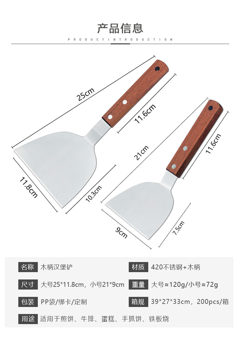 厂家直销木柄不锈钢韩式煎铲 烘焙披萨铲大号铁板烧压铲牛排煎铲