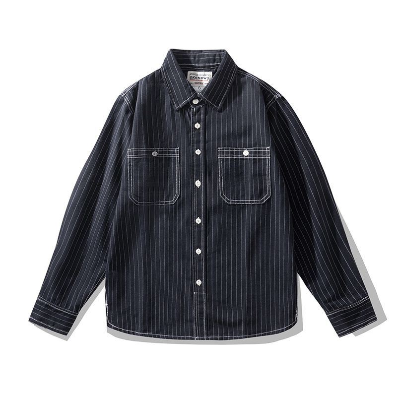 OKONKWO 새로운 세로 스트라이프 남성 셔츠 미국 복고풍 남성 작업복 긴 소매 셔츠스토어 가기