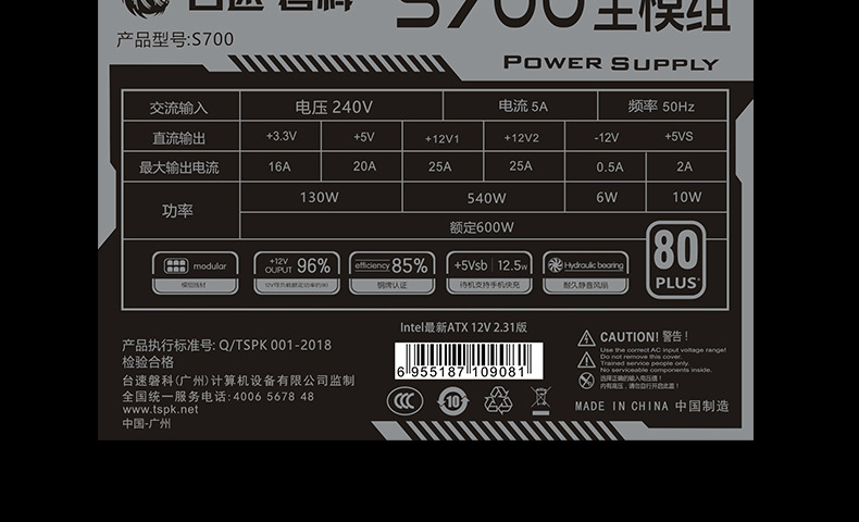 Taisingke S700 PC8P 전체 모듈 E-스포츠 80PLUS 컴퓨터 500W600W 데스크탑 호스트 ATX 전원 공급 장치