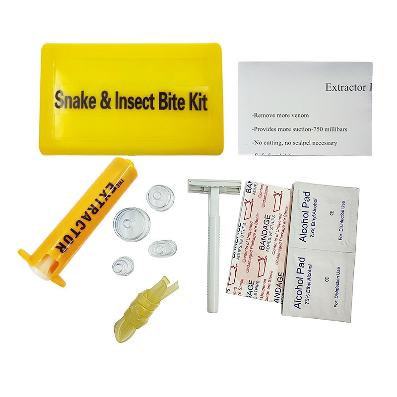 经常户外旅游的驴友们都会遇到被蛇虫鼠蚁攻击过的经历,这些生物大多无害,但是喜欢探险的驴友们经常会挺近深山野林,松厚的积叶和高密的草丛是一些毒蛇的绝好隐身处,一不小心被蛇咬到之后怎么办……呵呵! 大家都会想到想影视中的英雄一样,将毒液用嘴巴吸出来吧。但是,你错了,用嘴巴吸毒既不卫生也不安全,还会有另一个人中毒的风险。不过,现在好了,有我们的这款新品,操作简单,便捷安全,利用空气的压力,直接将毒液挤压出来。配有消毒湿巾和酒精片,简单快速就能将伤口处理好……