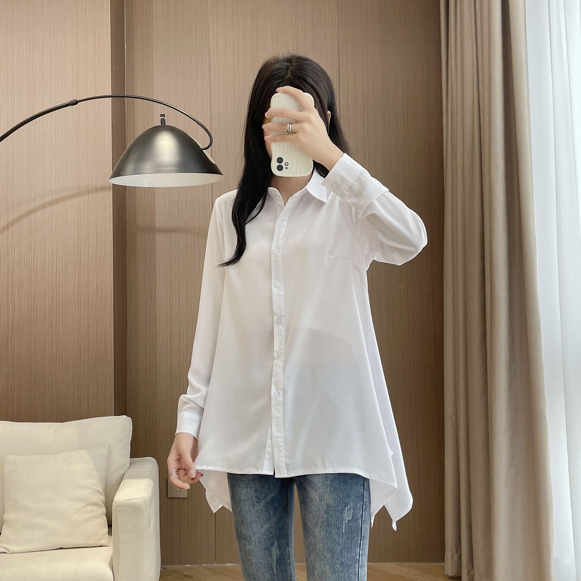 韩版宽松中长款女式白衬衫秋现货休闲性感纯色长袖衬衣女雪纺上衣 RMB:17.00