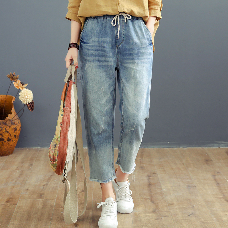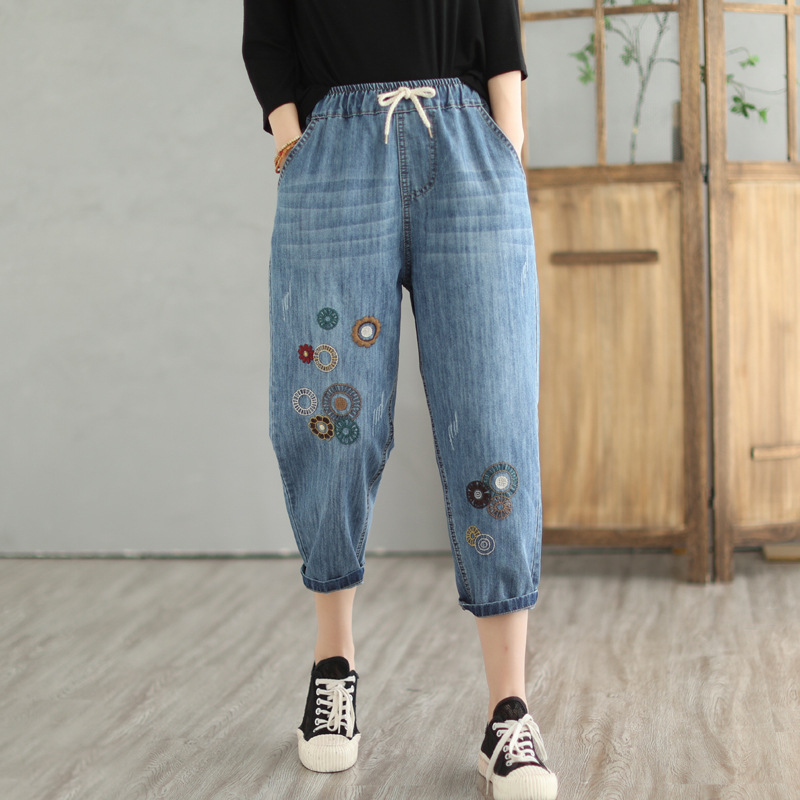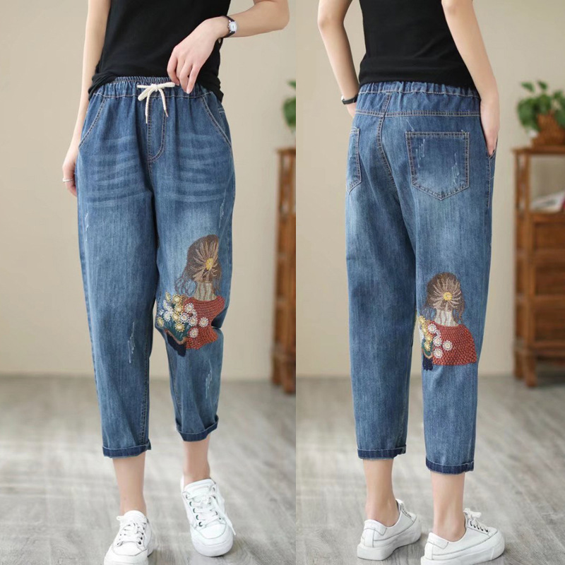 청바지 여자의 봄과 가을 새로운 자수 하이 웨이스트 빈티지 찢어진 여자의 바지 Harlan 바지 카프리 바지 플러스 사이즈