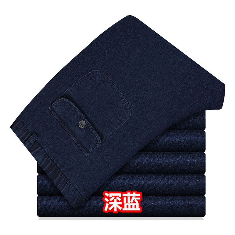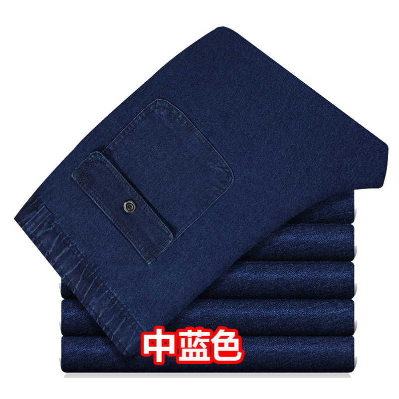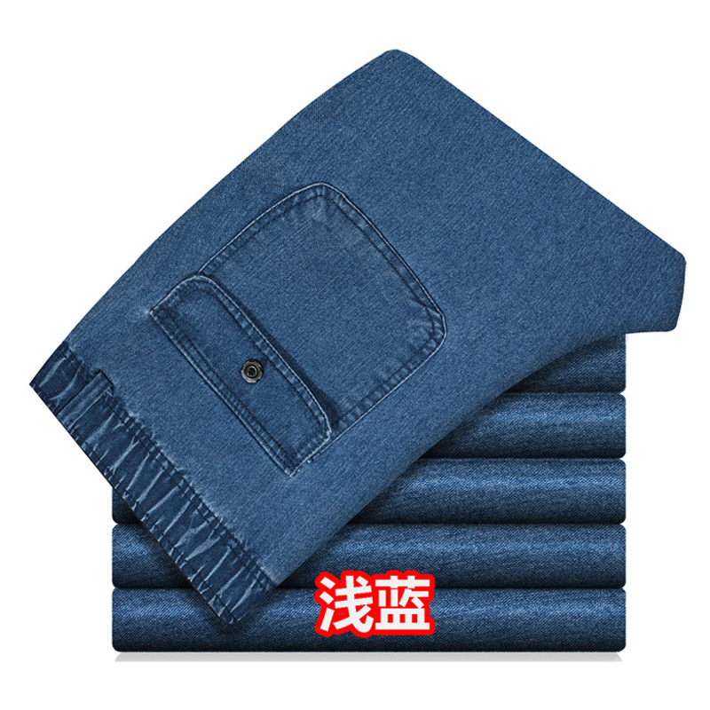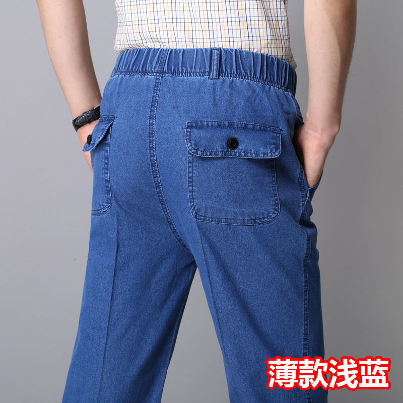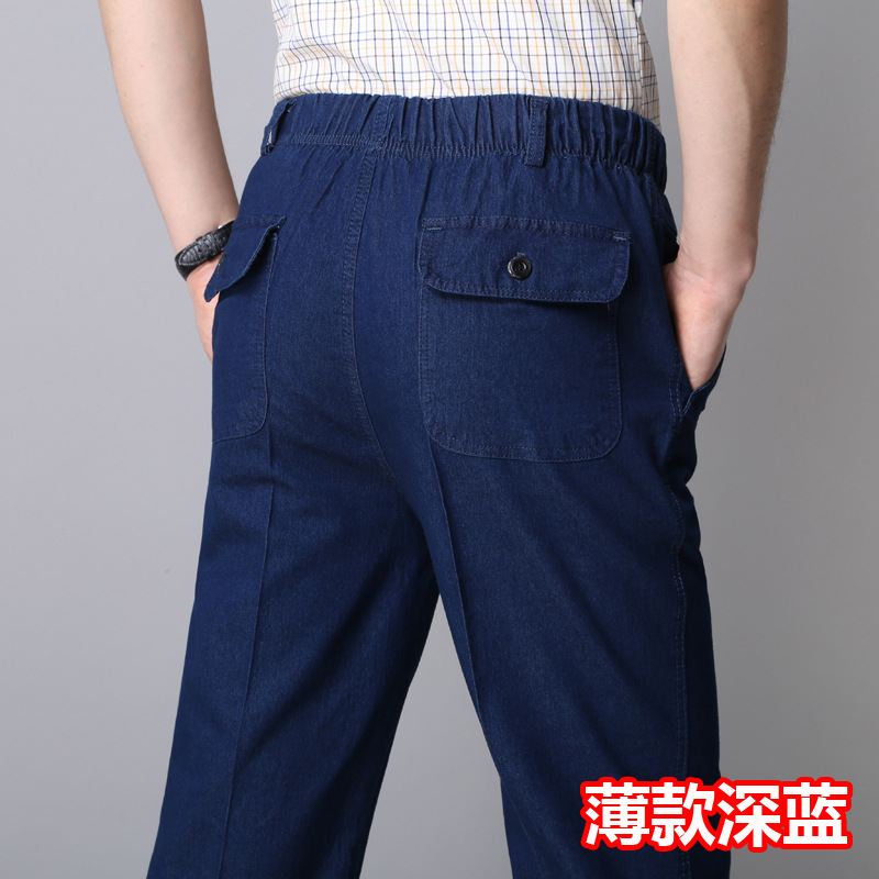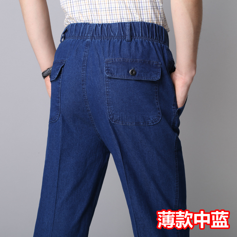 봄과 여름 얇은 남성용 청바지 탄성 허리 깊은 중년 및 노인 남성용 바지 하이 웨이스트 탄성 느슨한 데님 바지