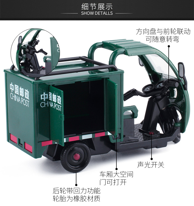 우편 배달 트럭 모델 소리와 빛 풀백 합금 3 륜 배달 트럭 자동차 모델 어린이 장난감스토어 가기