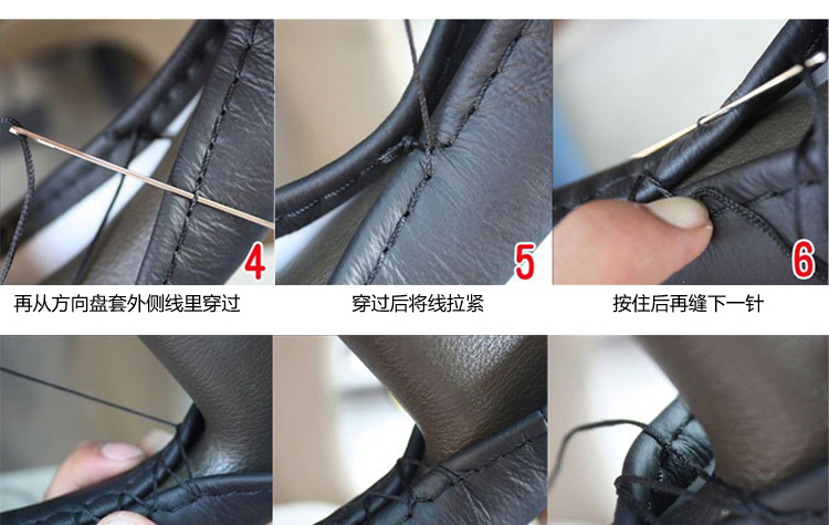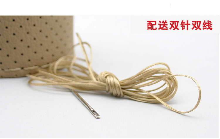 1 先把把套包住方向盘一端,用针头(针尖会刺到皮)缝上把套两端的车线。