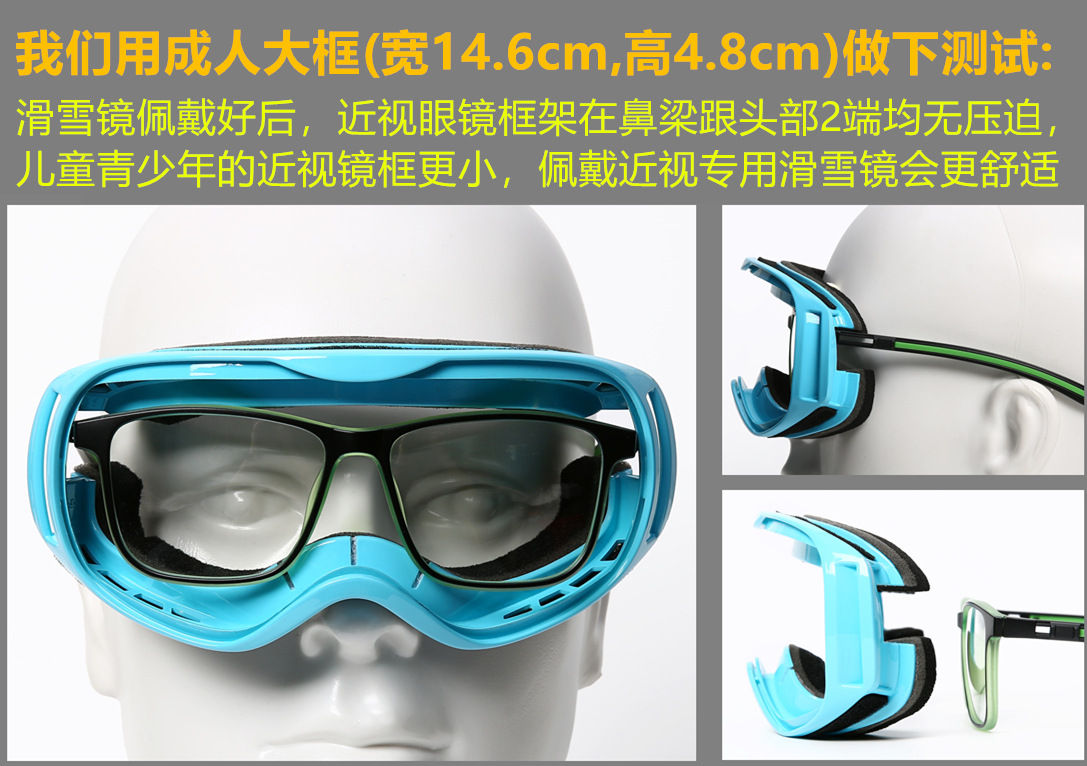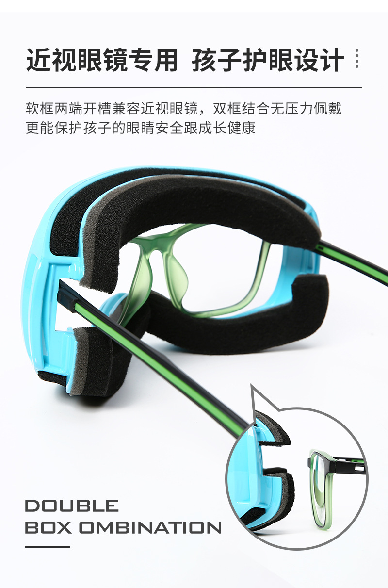 这款雪镜专为(5-15岁,头围48-58cm)近视孩子设计,套在原来的眼镜上佩戴无压力,超大框眼镜(宽度<15cm,高度<5cm)都可以无障碍兼容,近视孩子也可以畅享滑雪乐趣!