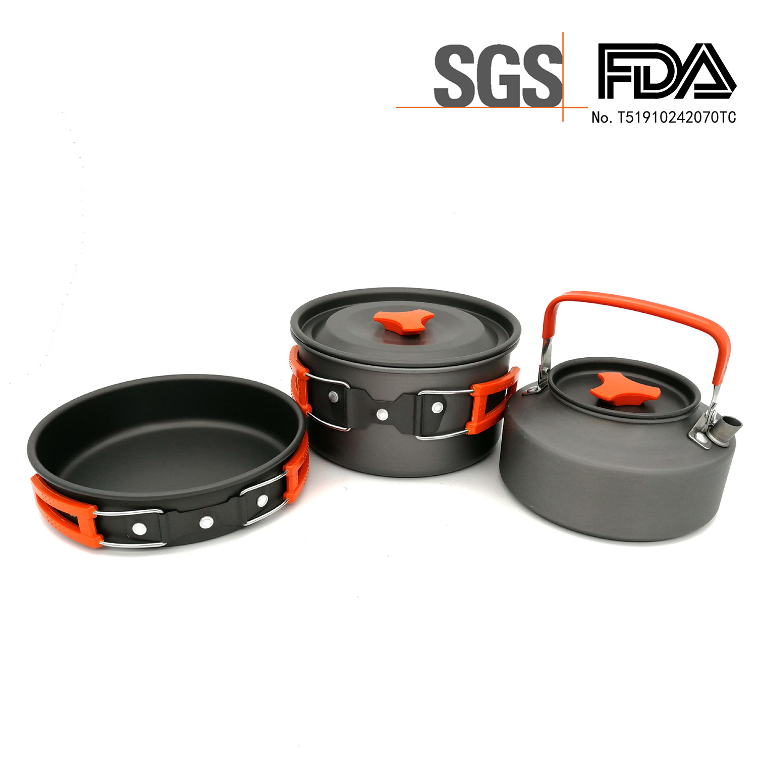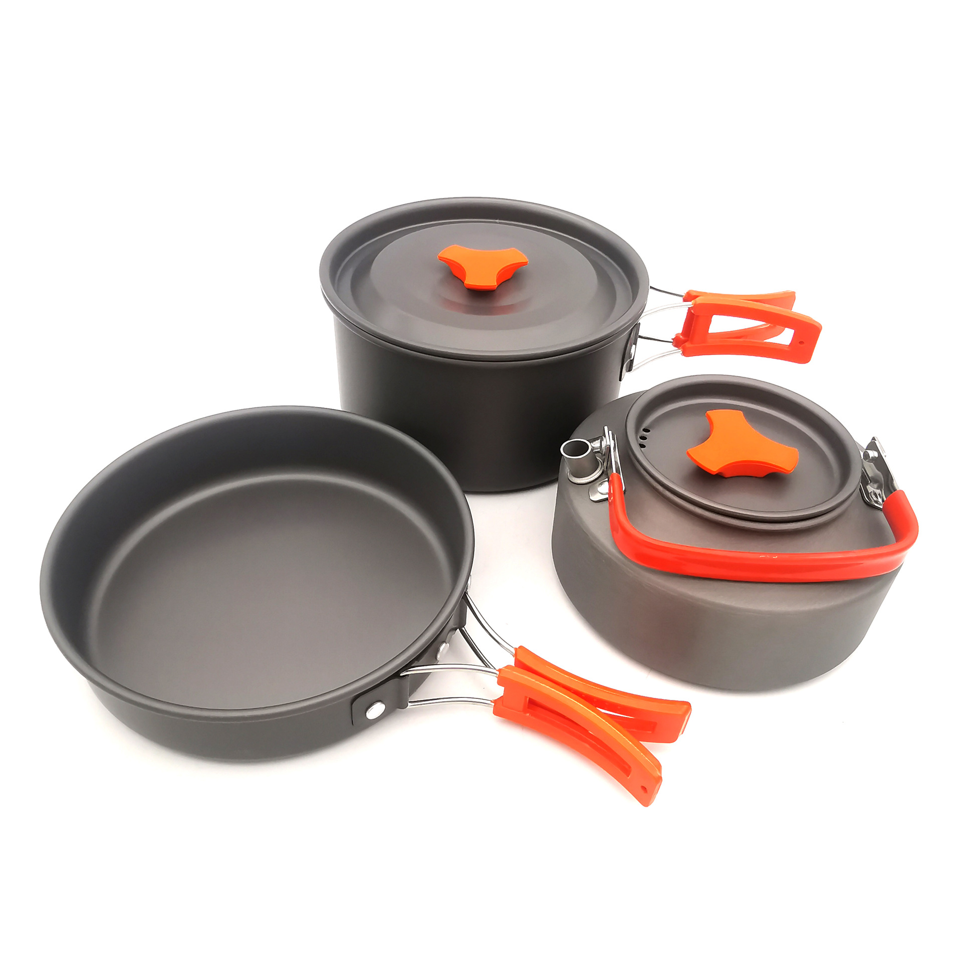 아마존 뜨거운 판매 야외 캠핑 세트 냄비 주전자 조합 2-3 인 세트 냄비 주전자 조리기구 3 종 세트