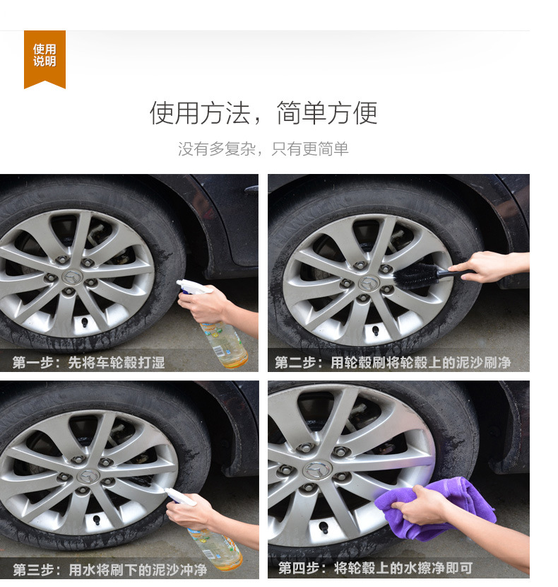 2.刷毛密度高,弹性好,刷下泥沙很容易清洗。普通轮毂刷容易粘附泥沙,难以清洗。