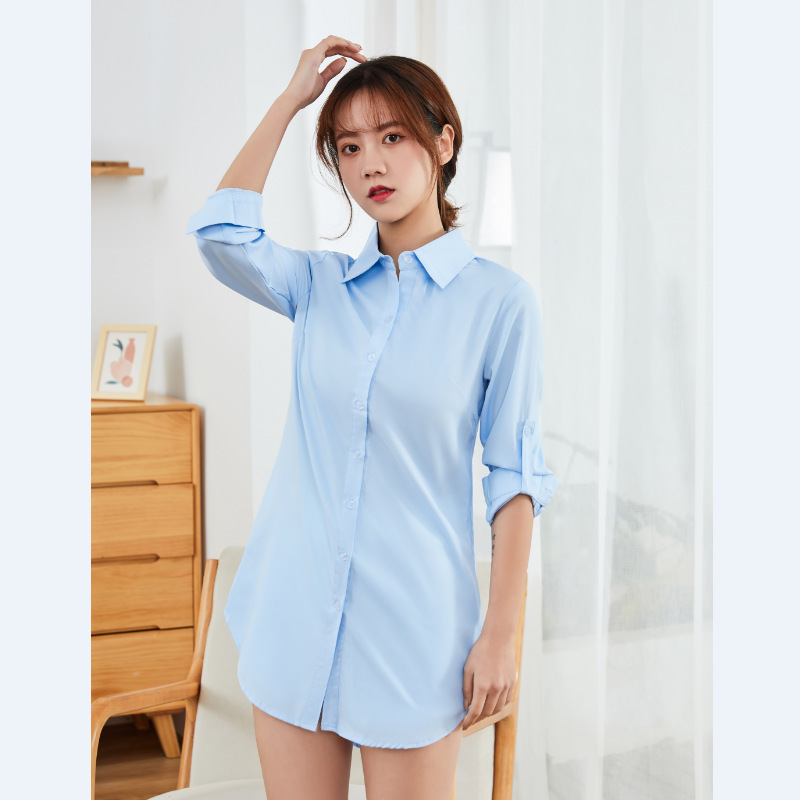 흰색 셔츠 여성 중간 길이 긴팔 한국식 루즈하고 다재다능한 학생 봄 바닥 bf 셔츠 대형 블루 핑크