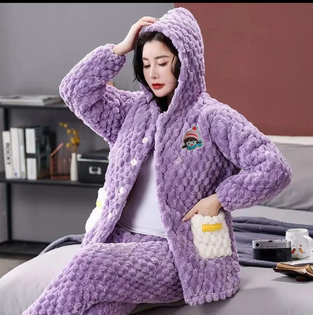 여자의 겨울 3 층 두꺼운 긴팔 따뜻한 기모 면 패딩 재킷 겨울 세트 가정 의류 산호 양털 퀼트 잠옷