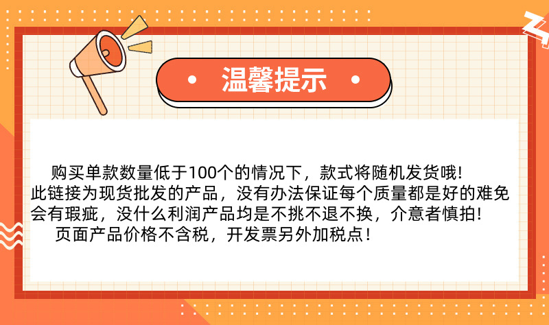 亲,本产品一个款式100个/包,散装,下单需要按照包数拍哦。没到包数的均随机发货,望谅解。这款含有铁丝,部分会有铁丝外露情况,一个批次生产下来难免会瑕疵属于正常现象,现货没多少利润呢,批发产品不挑不退不换哦,介意慎拍哦