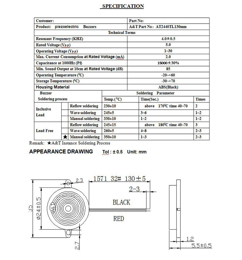 공장 도매 부저 시계 아름다움 악기 부저 AT2440TL130MM