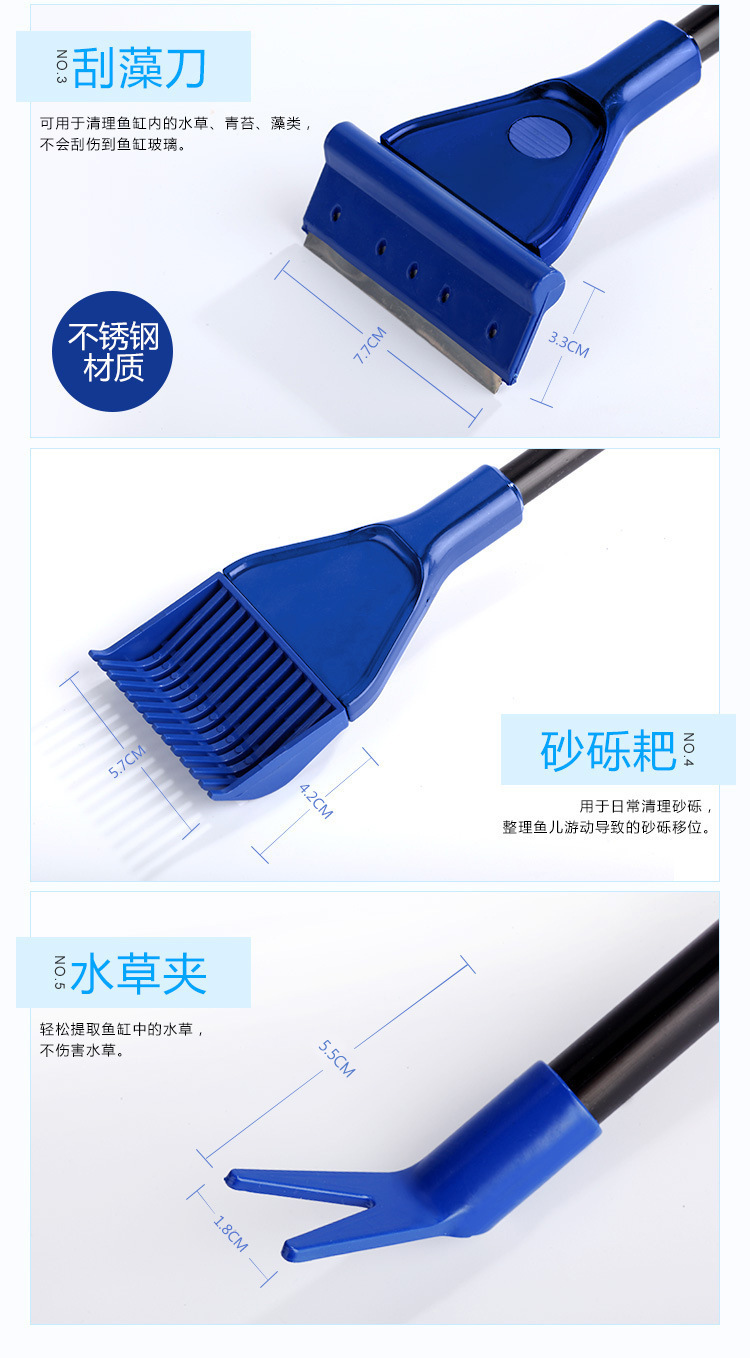 附带的5种配件,鱼捞,沙漏耙 藻类刷 水草夹 缸刷,使鱼缸清洁维护变得越来越简便。