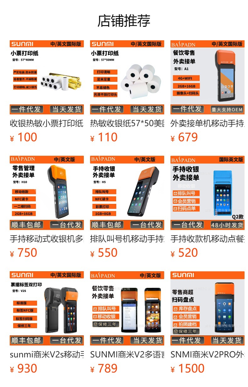 Sunmi V2PRO 테이크아웃 주문 기계 휴대용 모바일 금전 등록기 주문 기계 대외 무역 도매 영어 버전스토어 가기