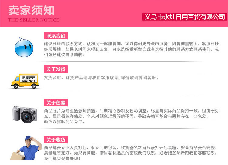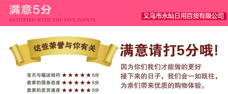 4、评价问题:我们重视每一位买家的评价。力求做到服务上。如果您收到宝贝后觉得有什么不满意的地方。请先不要急于评价。迅速联系店主详谈我们会给您一个妥善解决的方法,也请在为您解决问题后给出真诚的评价。