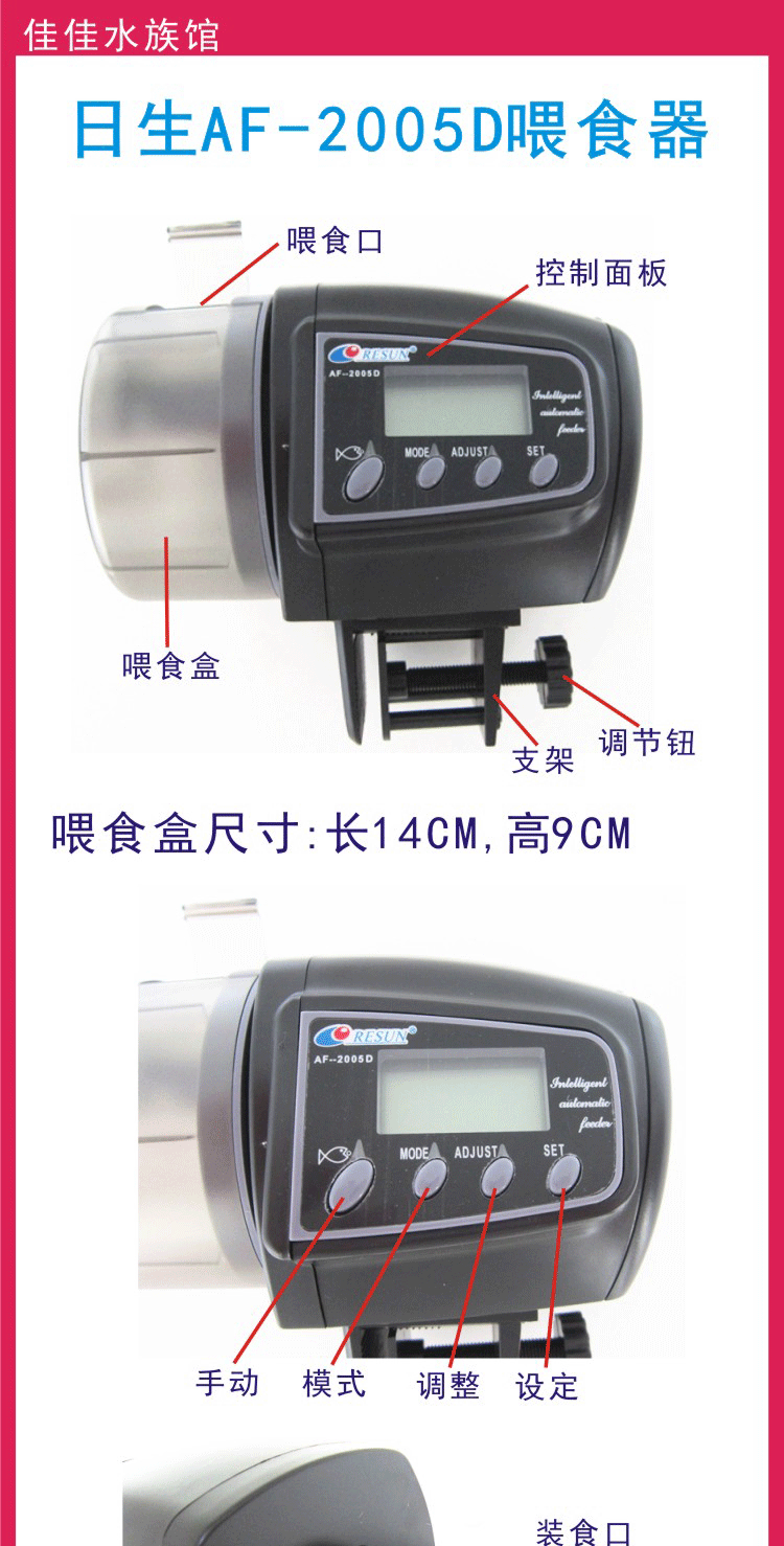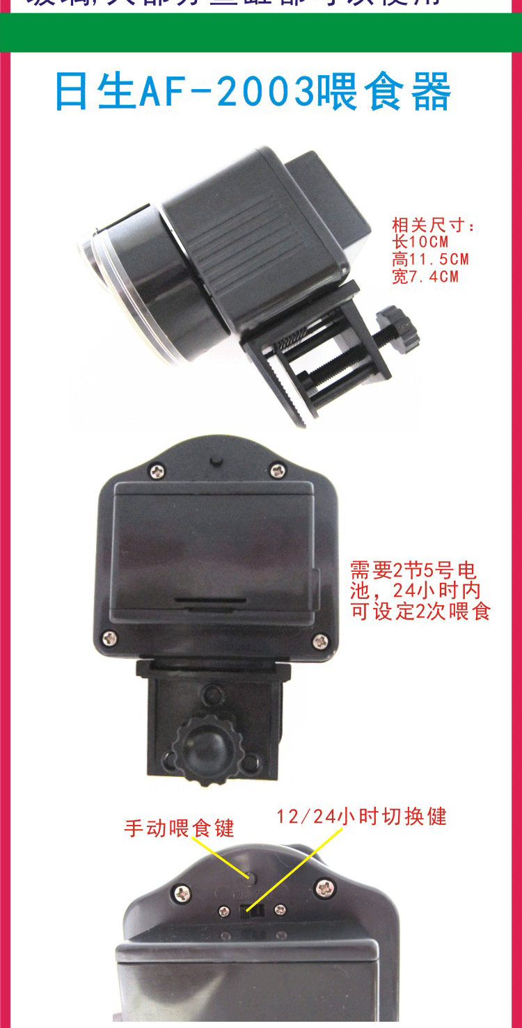 * 本品仅适用于小颗粒状鱼粮,小型家用鱼缸使用,不适用于片状鱼粮或大型鱼池鱼缸使用。