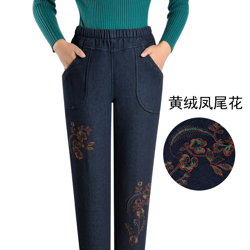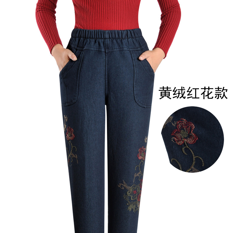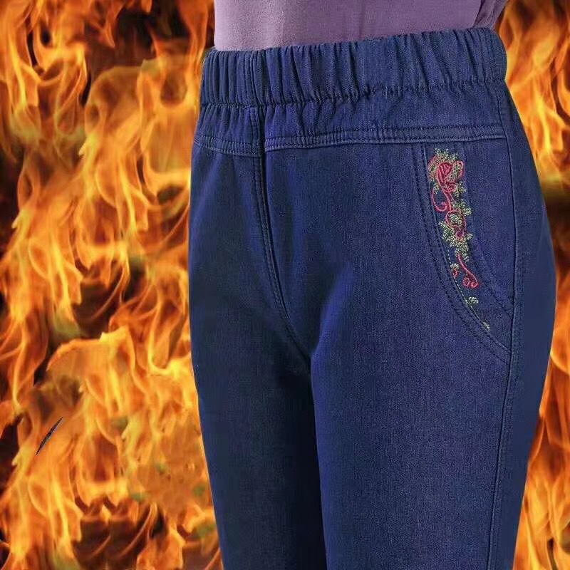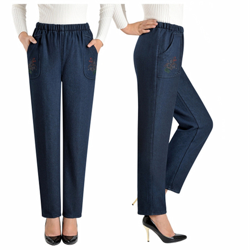 중년 및 노인 여성의 겨울과 가을 기모 청바지 할머니를위한 여성의 하이 웨이스트 느슨한 어머니의 플러스 사이즈 바지