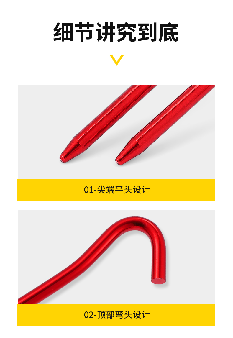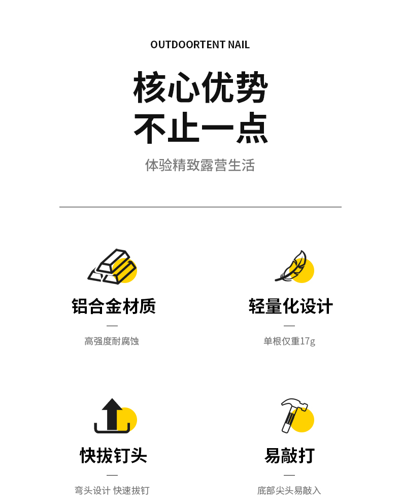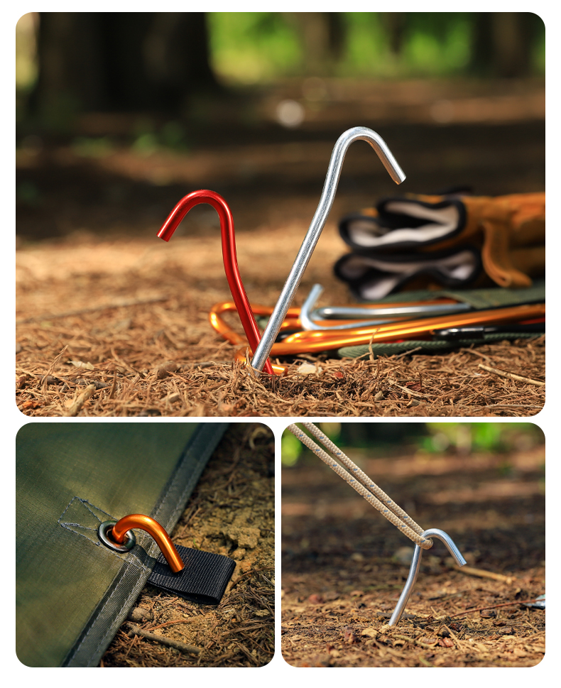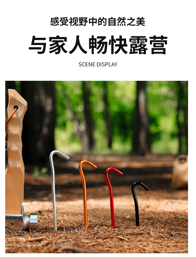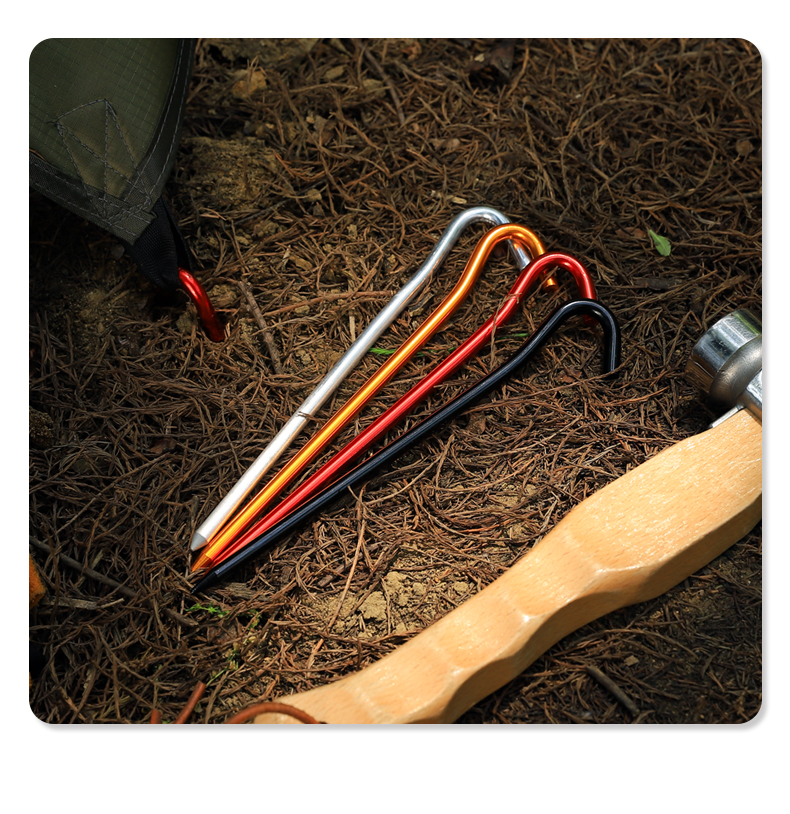 大多数帐篷地钉是细铁的,如遇硬地面很容易损坏,备用几个铝制地钉没错的。