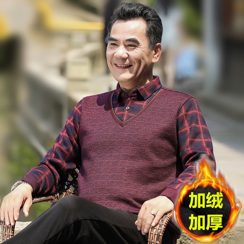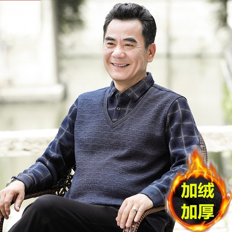 겨울 중년 남자의 아빠 겨울 니트웨어 중년 및 노인 남자의 기모 두꺼운 가짜 투피스 따뜻한 스웨터