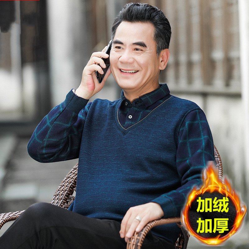 겨울 중년 남자의 아빠 겨울 니트웨어 중년 및 노인 남자의 기모 두꺼운 가짜 투피스 따뜻한 스웨터스토어 가기
