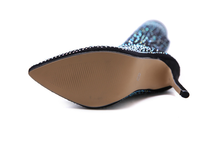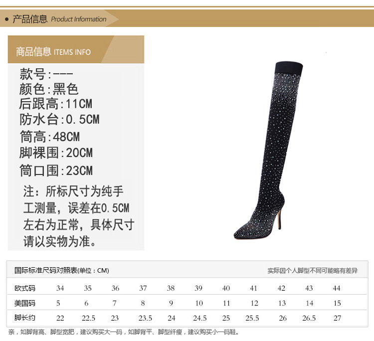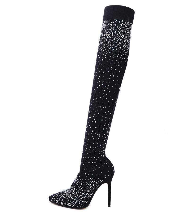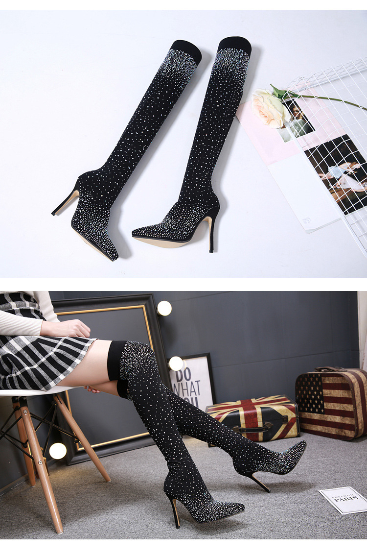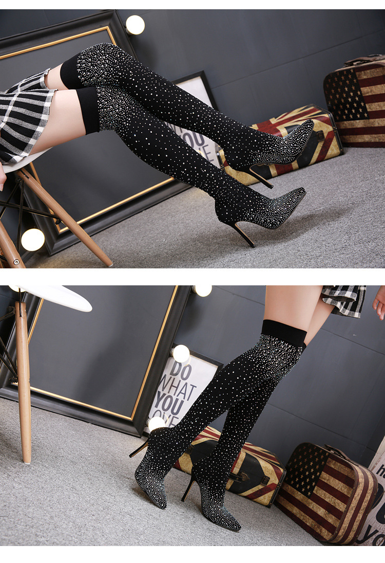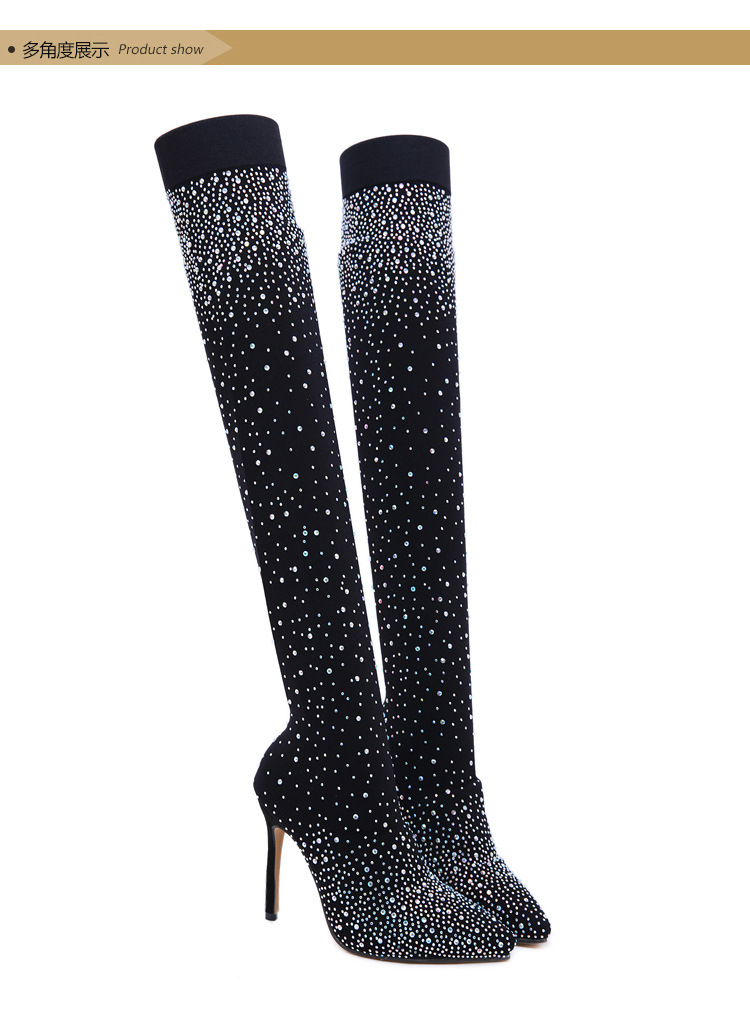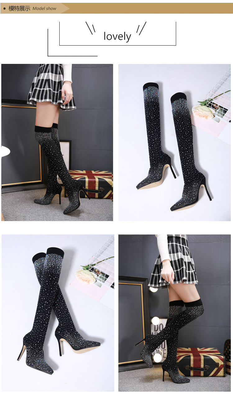 부츠 2024 폭발 유럽과 미국의 무릎 높이 부츠 뾰족한 얇은 뒤꿈치 여성용 모조 다이아몬드 탄성 양말 부츠 대형 여성용 부츠스토어 가기