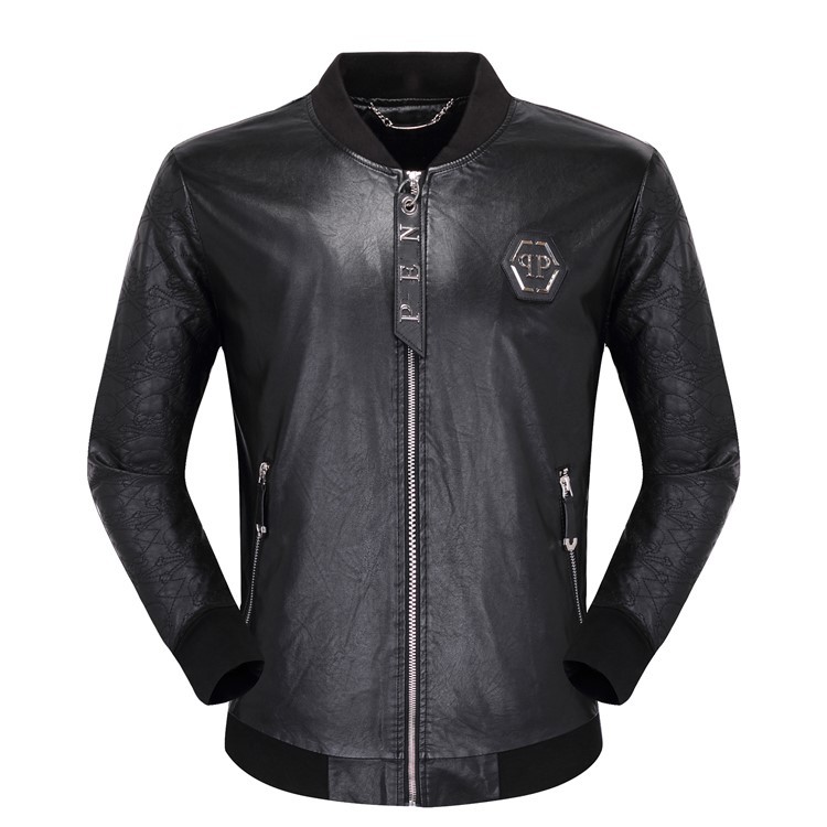 트렌디 브랜드 필립 플랜 가을과 겨울 새로운 남성 칼라 지퍼 양각 가죽 자켓 트렌디 브랜드 PP 플러스 코튼 남성 자켓