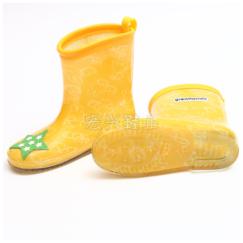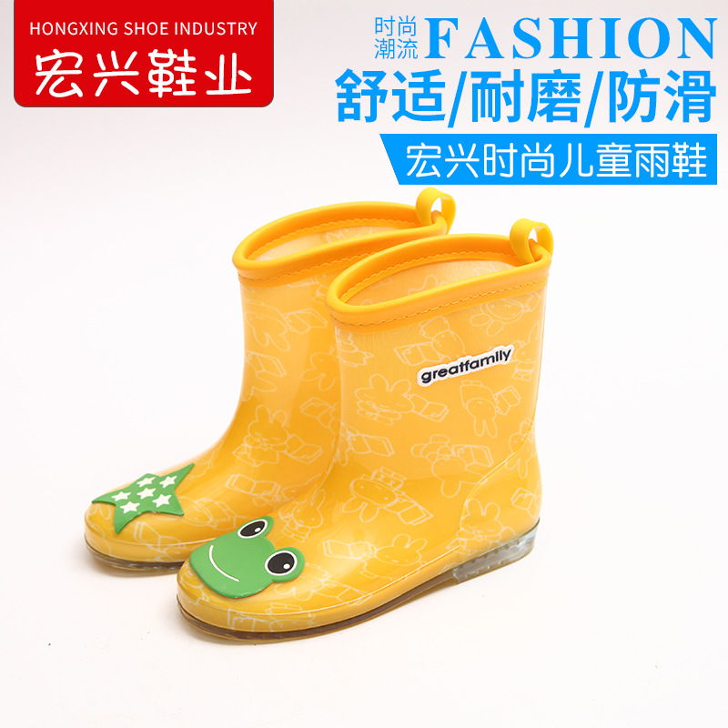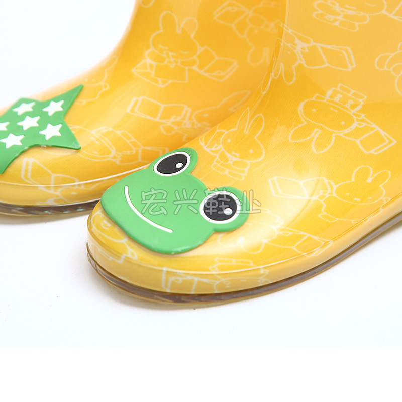 공장 직접 공급 어린이 만화 장화는 노란색 개구리 스타일 크리스탈 중간 배럴 장화를 처리 할 수 있습니다스토어 가기