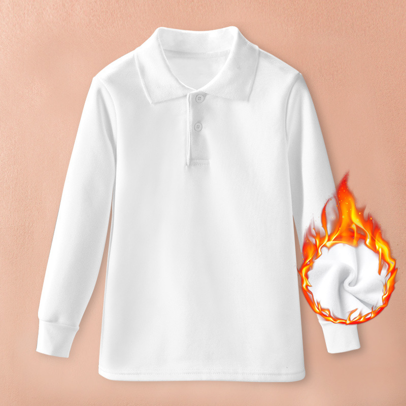 어린이 흰색 폴로 셔츠 긴팔 옷깃 흰색 티셔츠 겨울 기모 두꺼운 따뜻한 티셔츠 큰 아이 학생 교복 티셔츠