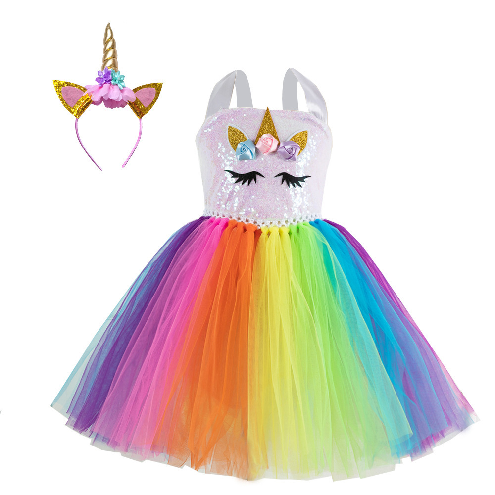 • 2023新款彩虹亮片女童连衣裙欧美公主裙卡通独角蓬蓬裙送翅膀头饰