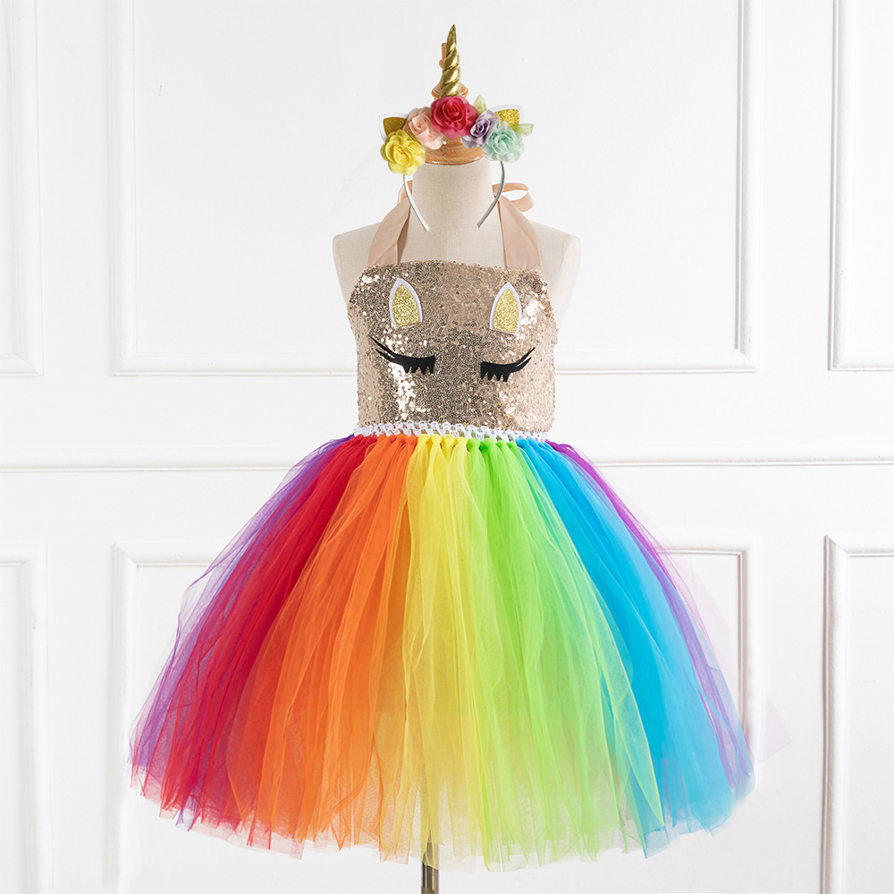 • 外贸童装万圣节cospaly彩虹亮片独角礼服裙女童连衣裙公主裙tutu