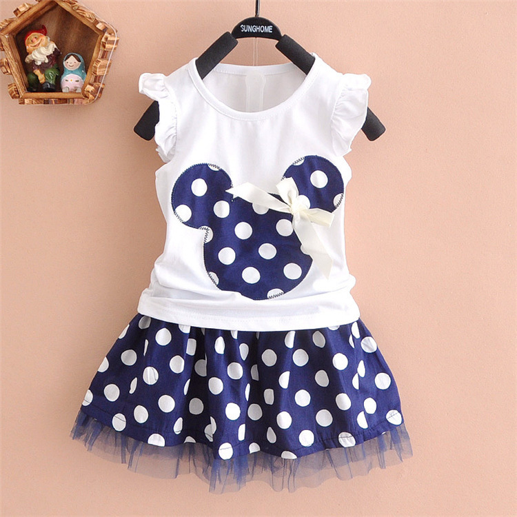 소녀의 새로운 미키 헤드 폴카 도트 정장 5 야드 옵션 Dropshipping 반팔 티셔츠 + 짧은 스커트 2 피스 세트