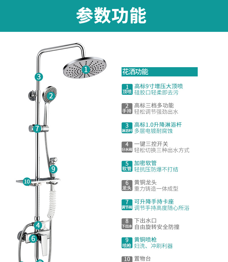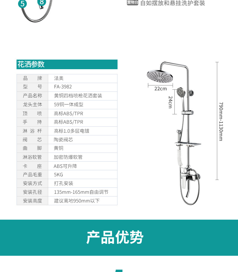Faw 모든 구리 수도꼭지 샤워 세트 표면에 스프레이 건 가압 4 단 샤워 노즐 세트 장착