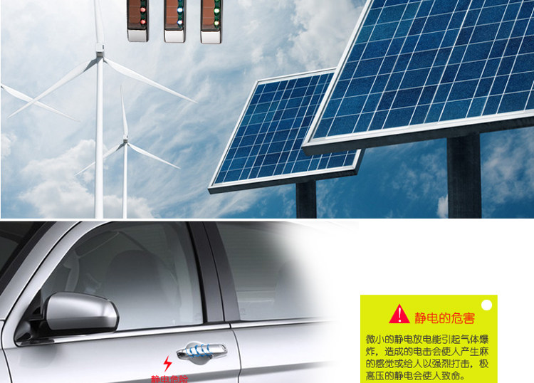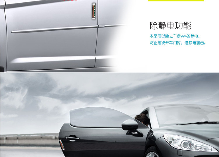 本产品内置放电模块,模块一端通过纯铜弹簧接触于车身,另一端连接于导电的产品外壳,当车身电荷积蓄到一定程度,车身与产品外壳之间会有一个较高的电位差,此时车身静电会击穿模块内放电器件,通过产品外壳将静电释放于空气中。在打开车门前,我们还可以用手先触碰一下产品表面镀层,放除人体静电,避免人体放电时带来的接触性静电触人。