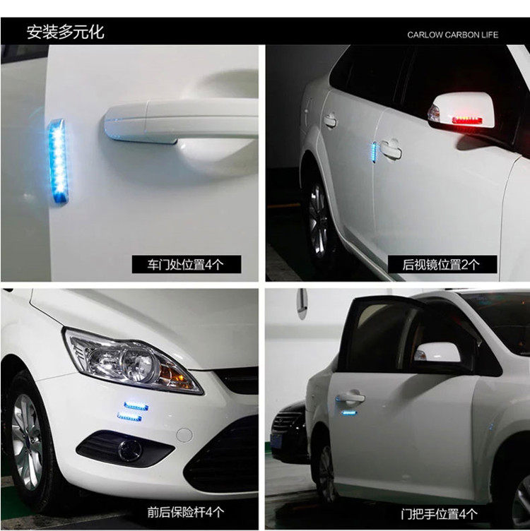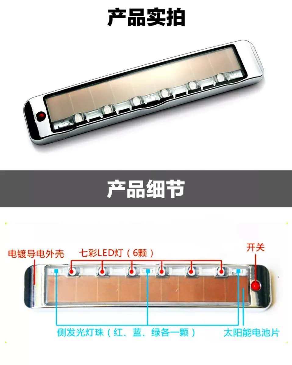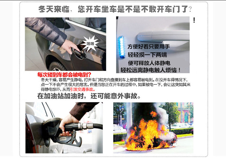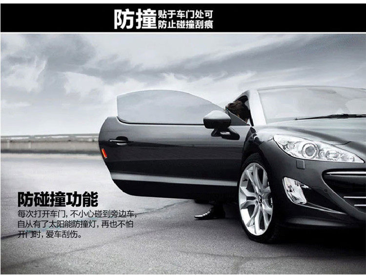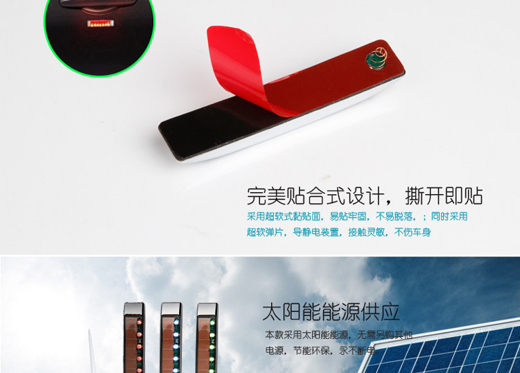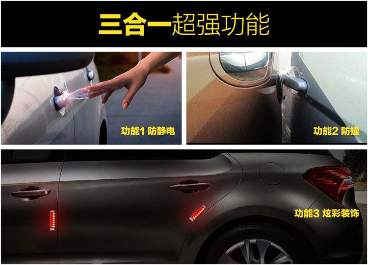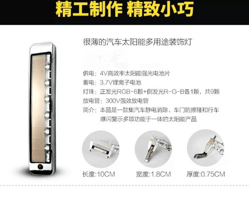 除静电、防撞、正面侧面警示装饰灯三合一功能,值得购买几大理由 :① 太阳能续电,光控震动感应,免接线;②多种警示灯模式可调; ③可避免静电电人; ④有效预防开车门时撞到导致车身受损! 安装多元化:门拉手附近,外后视镜后面没有灯的,尾门拉手部位,保险杠两边等;触摸宝贝便可去除人体静电,远离静电烦恼!