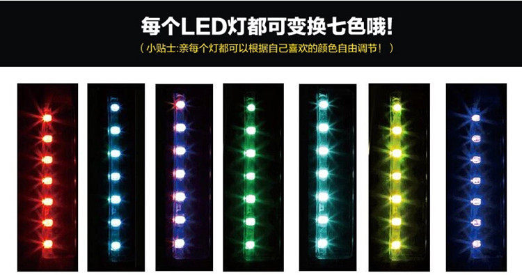 RGB三色LED 7颗 | 蓝 红 绿 暖白 黄 紫 青,共7种灯色可以调整 | 1蓝灯频闪-2蓝灯呼吸-3蓝灯恒亮-4绿灯频闪-5绿灯呼吸-6绿灯恒亮-7红灯频闪-8红灯呼吸-9红灯恒亮-10青色频闪-11青色呼吸-12青色恒亮-13紫色频闪-14紫色呼吸-15紫色恒亮-16黄色频闪-17黄色呼吸-18黄色恒亮-19白色频闪-20白色呼吸-21白色恒亮-22七彩自动慢变 |