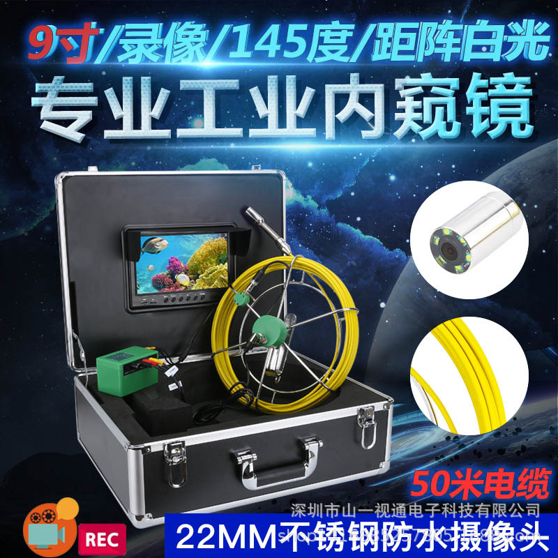 型号:F9300D-50M 配置:9寸屏录像屏送8G卡,,直径22mm探头,高清1000线 ,镜头角度145度,50米管道内窥镜,4500MA内置电池,带电量显示,灯亮度可调,保护套38MM,补光灯6颗6W距阵白光,线直径5MM,电池续航约8小时。