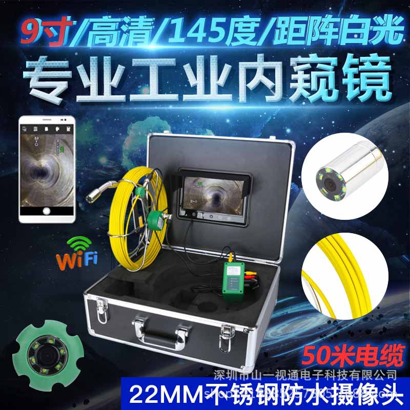 型号:F9300WF-50M 配置:9寸屏,直径22mm探头,高清1000线 ,镜头角度145度,50米管道内窥镜,4500MA内置电池,带电量显示,灯亮度可调,保护套38MM,补光灯6颗6W距阵白光,线直径5MM,电池续航约8小时。内置WIFI热点,无线距离100M,手机APP可观看,拍照,录像,支持安卓与苹果系统。
